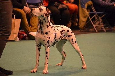 27th March 2016 - North Of England Dalmatian Club - 1st Veteran Bitch, Best Veteran Bitch, BEST VETERAN IN SHOW - Marricdale The Gold Digger Of Dalamanti ShCM - judge Karyn Wight - critique: "Veteran (15:6) 1, Barrett’s Marricdale the Gold Digger at Dalamanti ShCM: L/W bitch 9 years old but clearly no one has told her! This bitch went like a train round the ring and at times her handler needed to just slow her down a touch. A really happy girl who is well constructed and nicely angulated throughout, good spring of rib and well bodied. She could still do the job she was bred for whilst still being feminine. BVB and BVIS"