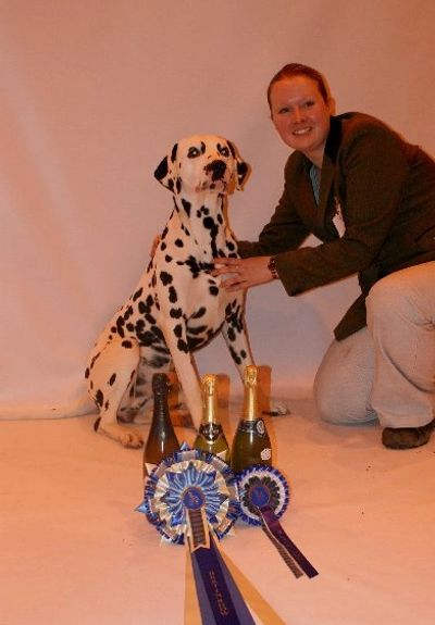 15th February 2014 - Joint Dalmatian Clubs Championship Show - Reserve Open Dog - CH Shulune Ice Phantom of Dalamanti ShCM - Judge J Swinburn 19th April 2014 - Dalmatian Club Of Scotland Championship Show - 2nd Open Dog- CH Shulune Ice Phantom of Dalamanti ShCM -Judge Mr Alan Cuthbertson - critique: "2nd Barret & Fort’s Ch. Shulune Ice Phantom of Dalamanti Sh.CM. An upstanding black spotted male with a good striding action on the move. Masculine head with good reach of neck. Strong bone and good muscle. Level topline and good tailset held well on the move. Nice turn of stifle."